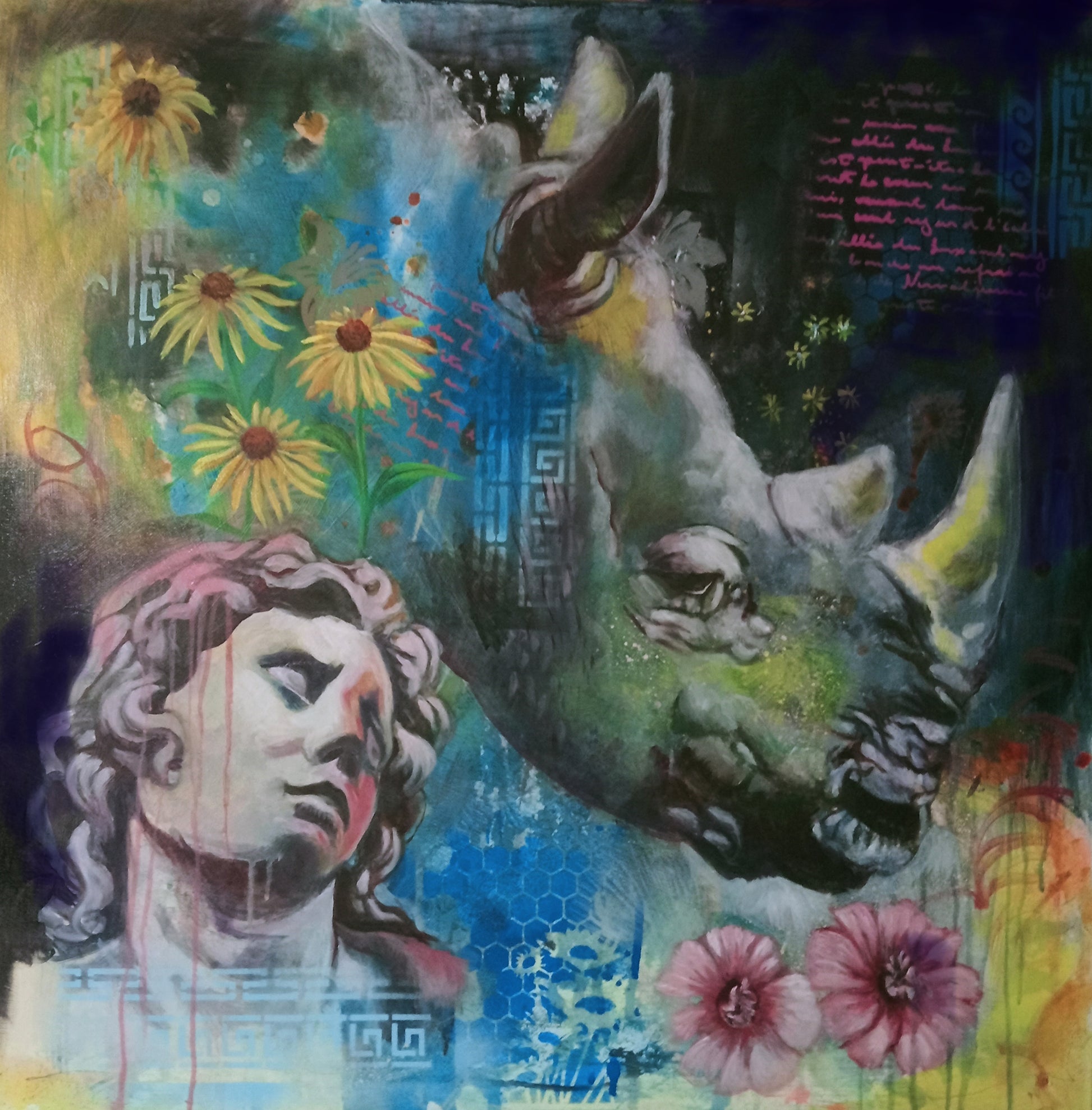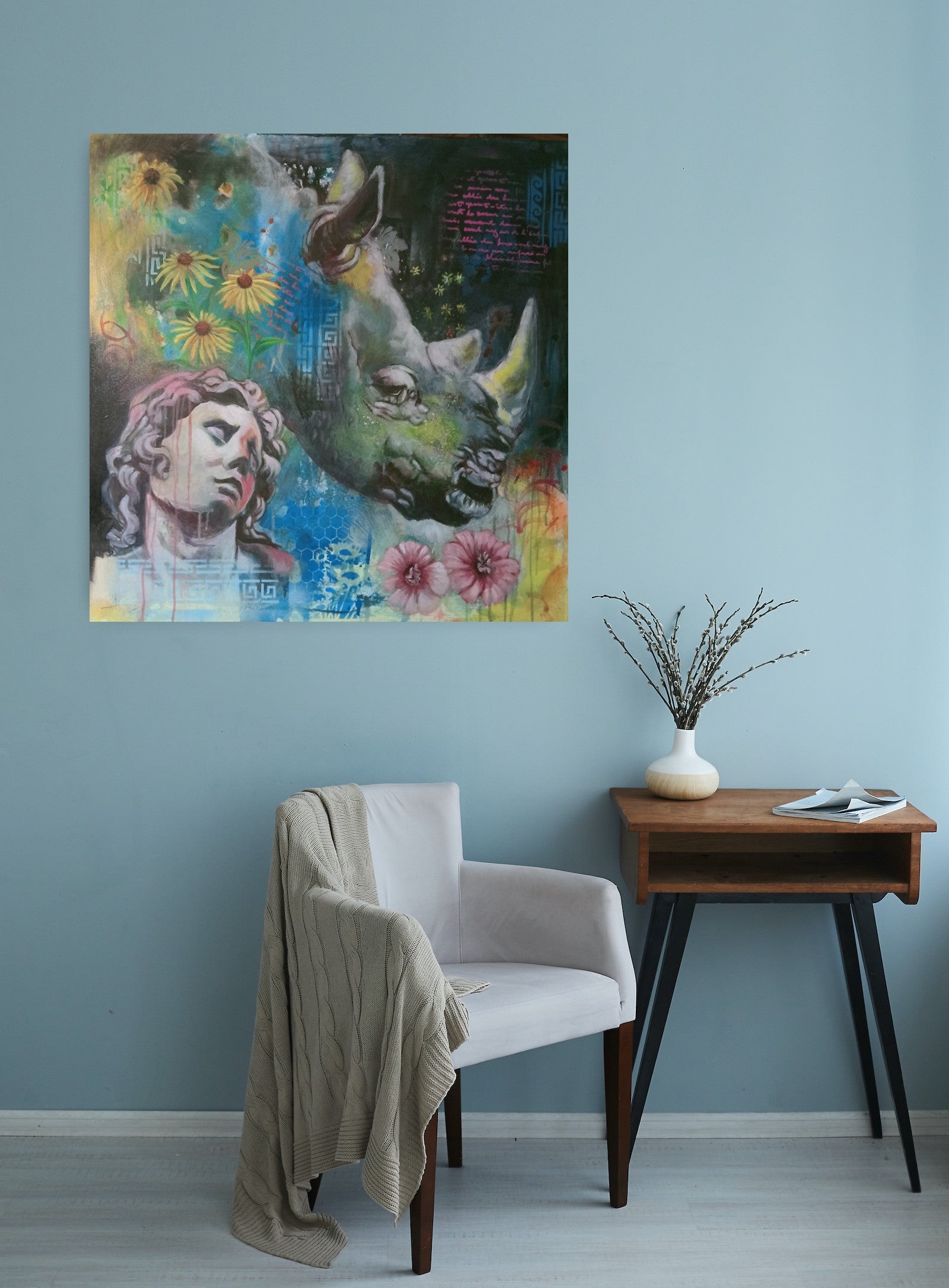 Kracht en kwetsbaarheid verenigen zich in dit werk, waarin Alexander de Grote gecombineerd wordt met de oerkracht van de neushoorn.