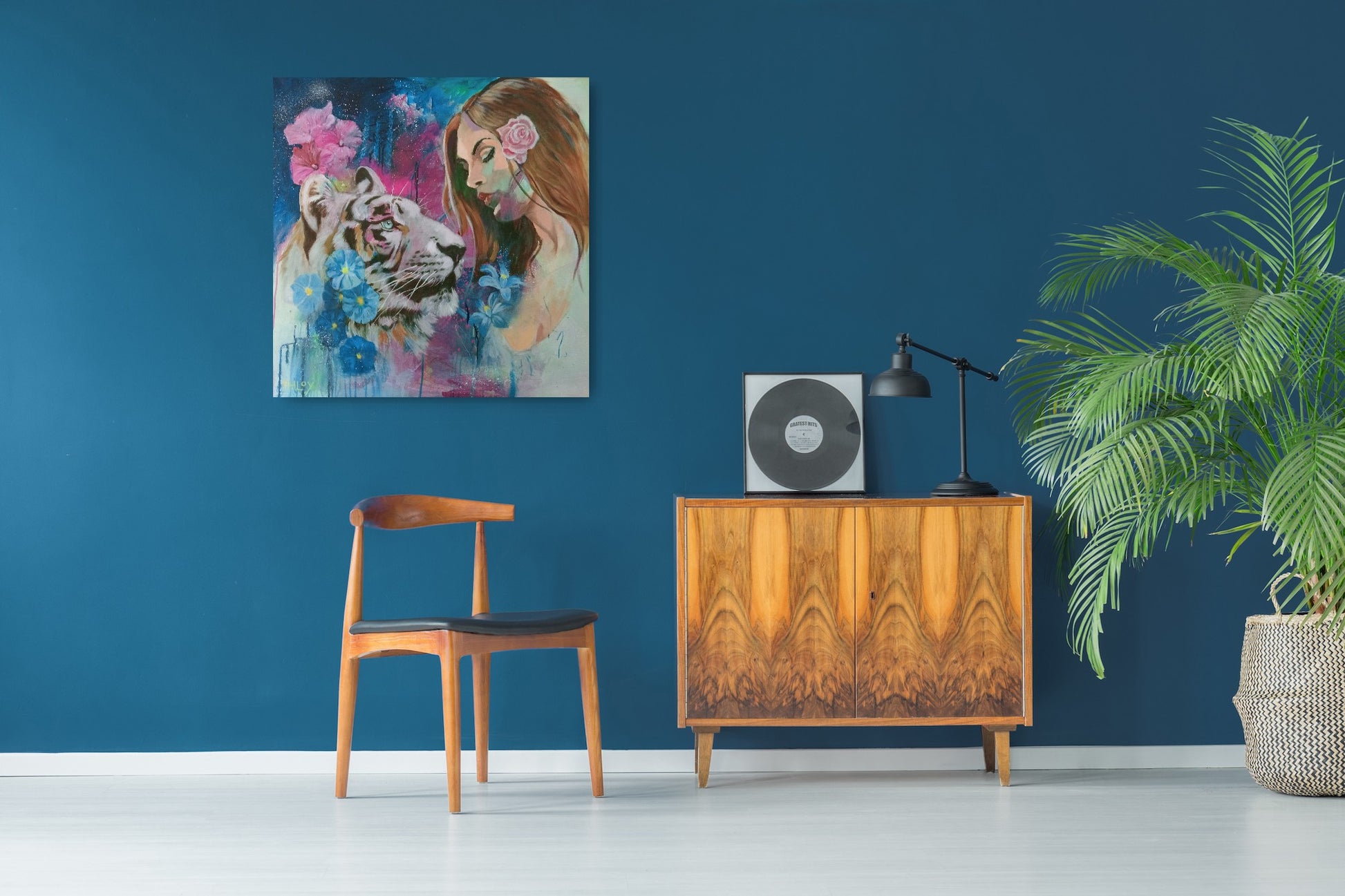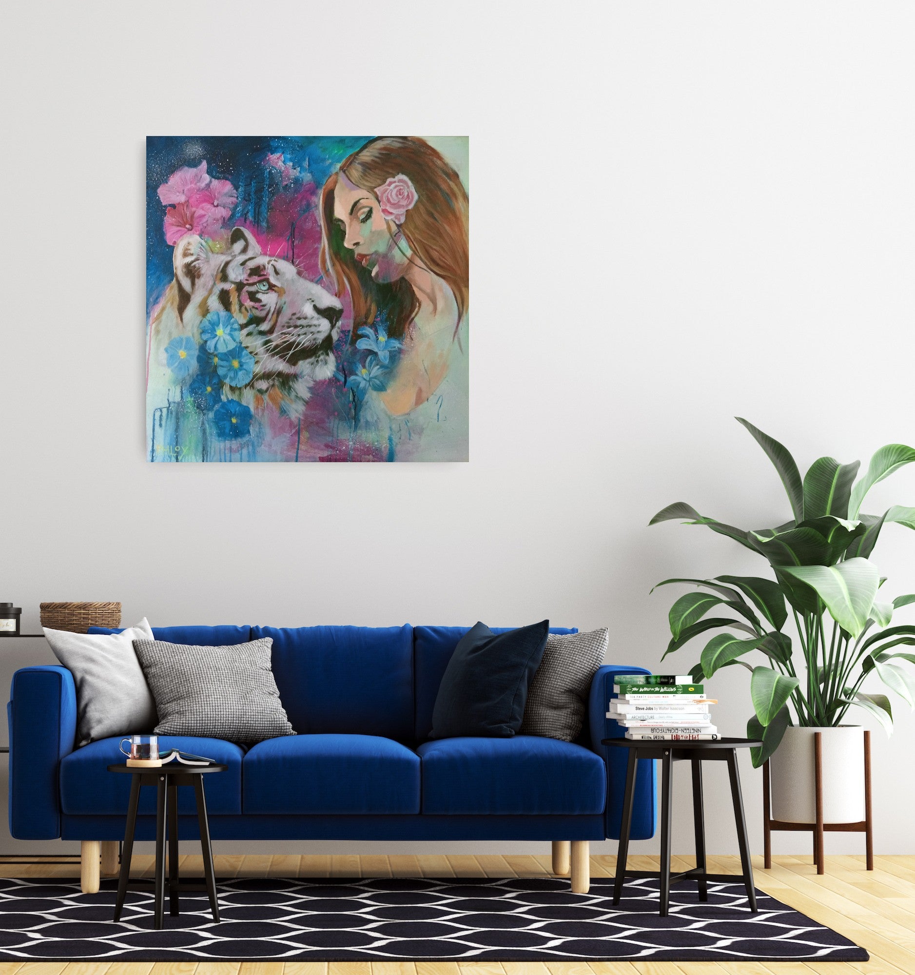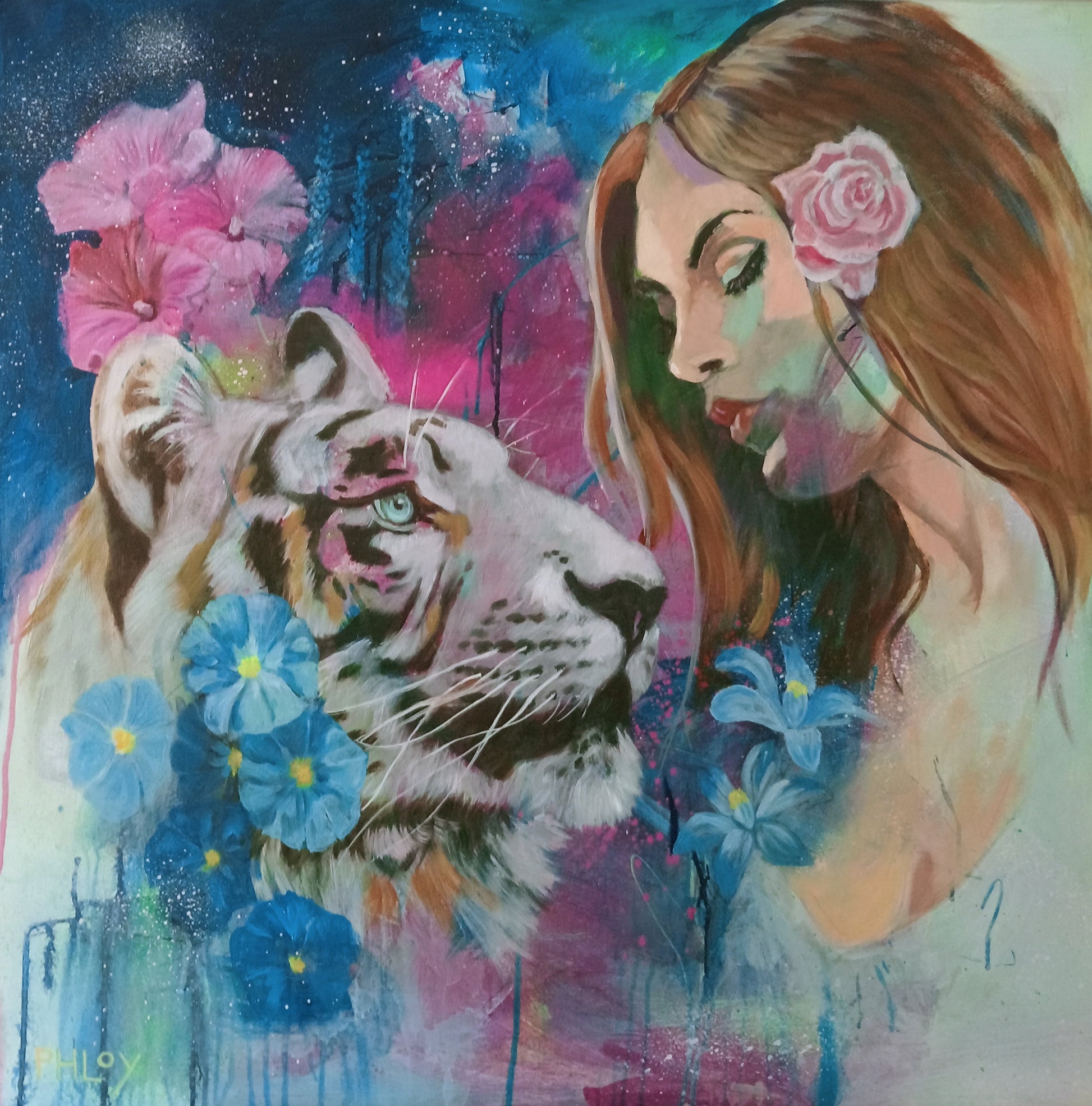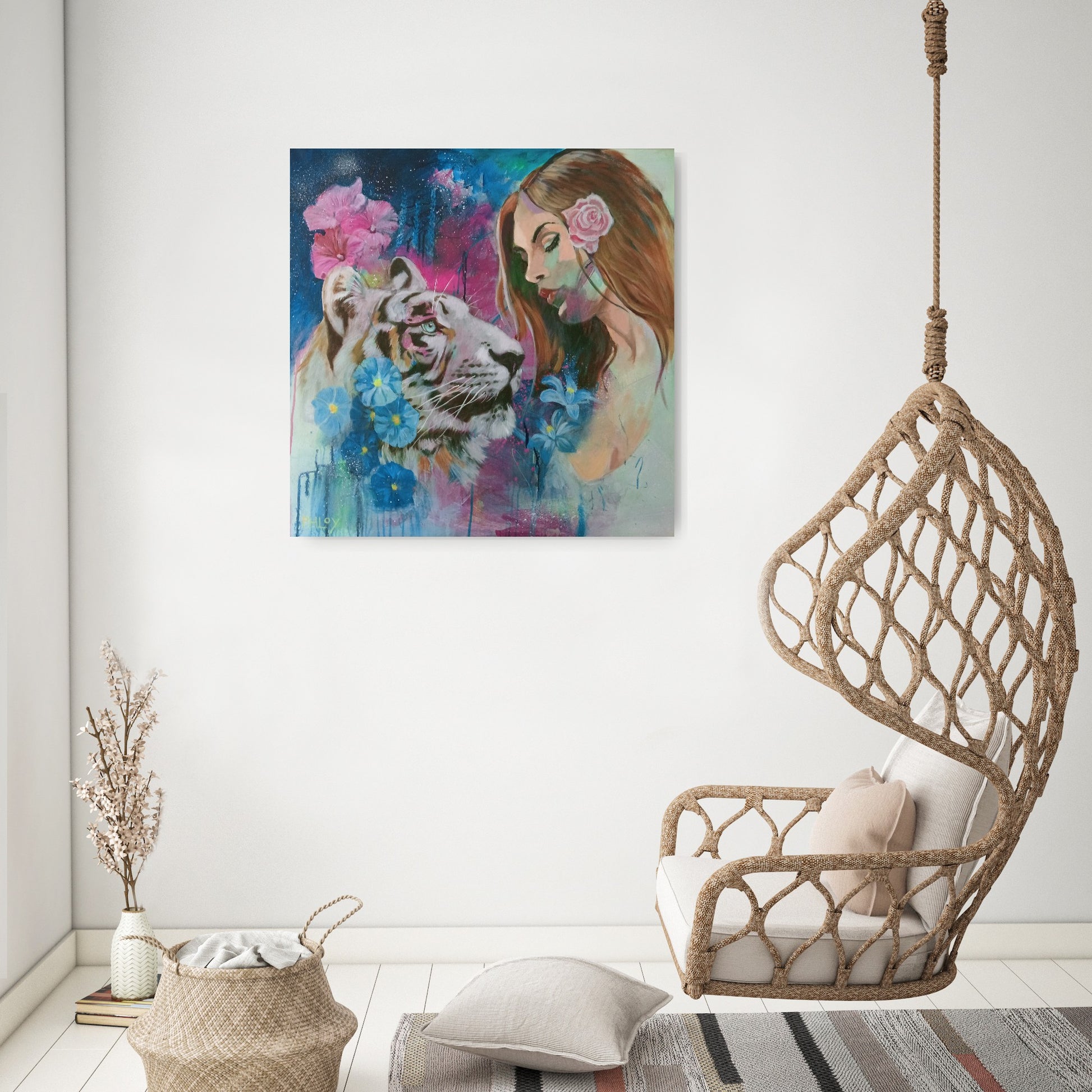 De tijger straalt puurheid en mysterie uit, terwijl de jonge vrouw met haar bloem een symbool van tederheid en verbinding vormt. Hun ontmoeting ademt harmonie tussen natuur en cultuur, tussen instinct en intuïtie.